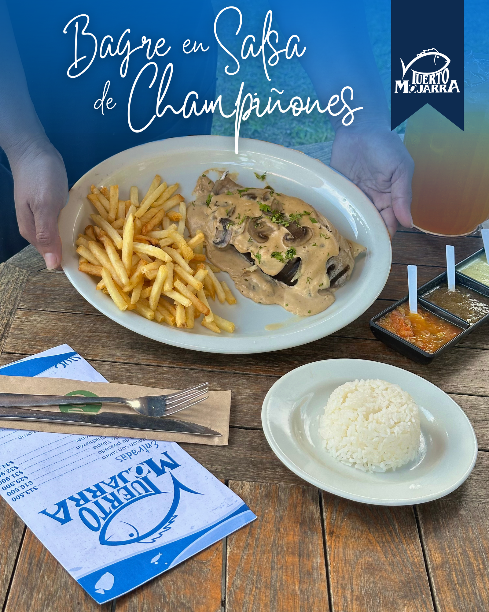 Generosa rodaja de bagre de 300 gr, bañada en salsa de champiñones, preparada con ese sabor creativo que caracteriza nuestra cocina. Se sirve acompañado de arroz blanco, y papas a la fracncesa, logrando un plato diferente y muy sabroso.