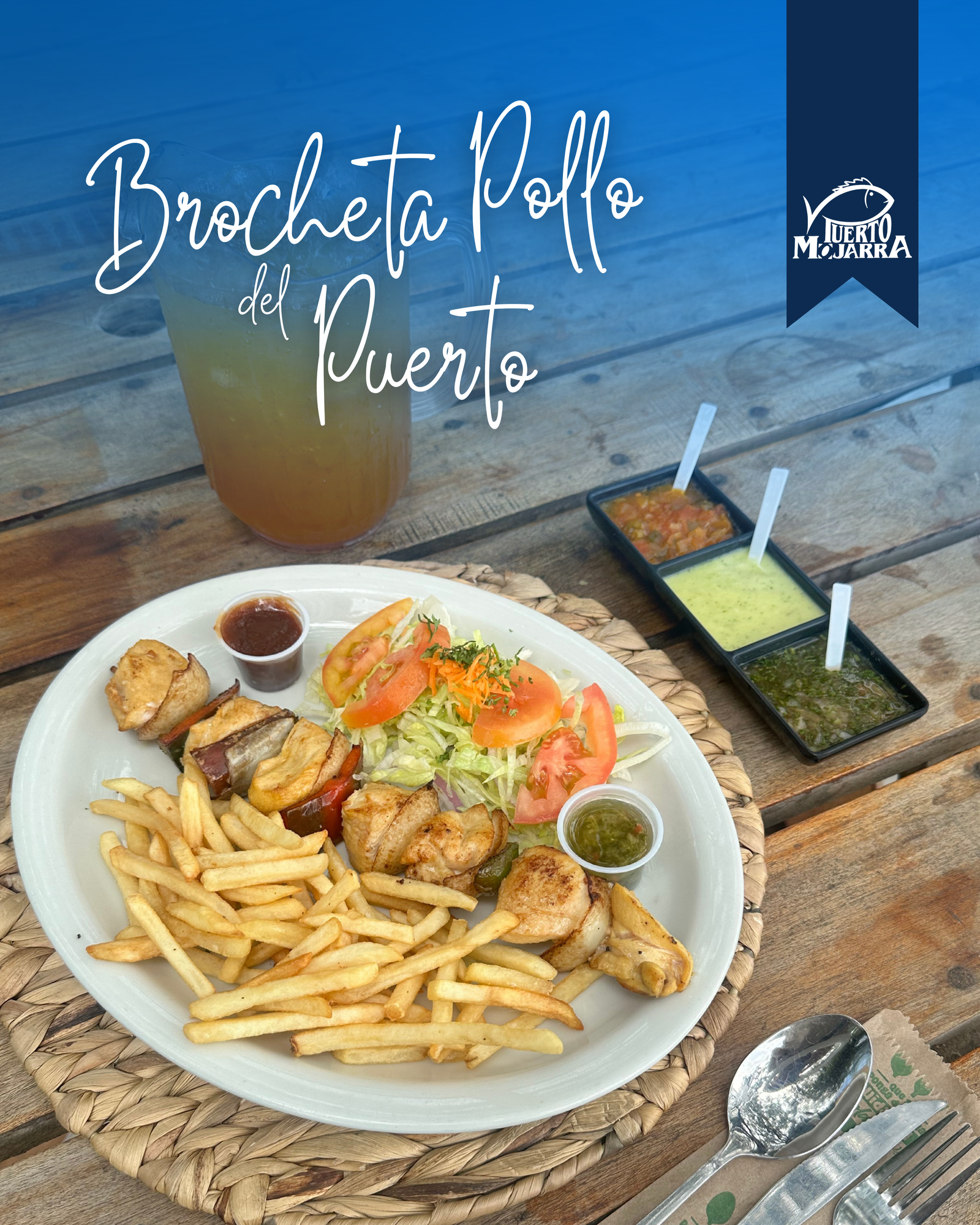 225gr de trozos de pollo, asados al punto perfecto y combinados en una brocheta con pimentón y cebolla cabezona, con salsa Bbq que aportan aroma y un sabor irresistible a la parrilla. Se acompaña de papas a la francesa doradas y crujientes y una ensalada fresca de lechuga batavia, tomate, zanahoria y cilantro, que equilibra cada bocado.