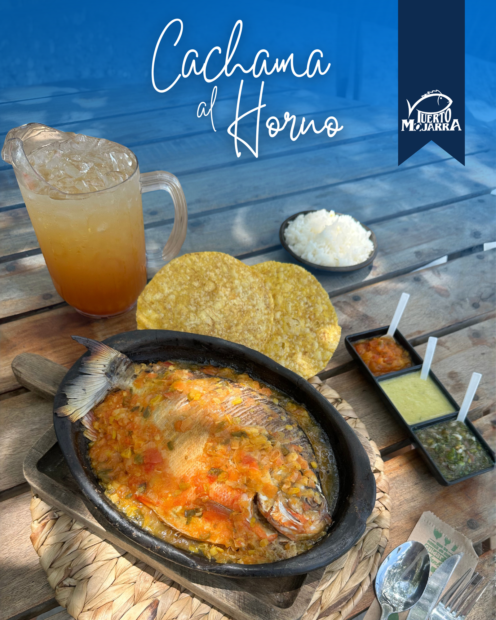 1 Cachama entera de aproximadamente 600gr, cocida lentamente al horno y bañada en hogao casero, preparada con ingredientes frescos y ese sabor que recuerda a la cocina de casa. Una preparación jugosa, llena de tradición y aroma. Se acompaña de arroz blanco y un patacón grande, delgado y extra crocante, perfecto para disfrutar de cada bocado.