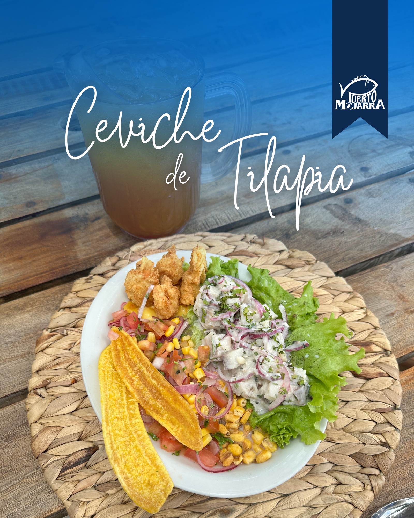 Ceviche fresco de tilapia, preparado al estilo peruano, con sabores cítricos y bien equilibrados que resaltan la suavidad del pescado. Se acompaña de camarones apanados, dorados y crocantes, y un pico de gallo al estilo peruano. Lleno de frescura y carácter.