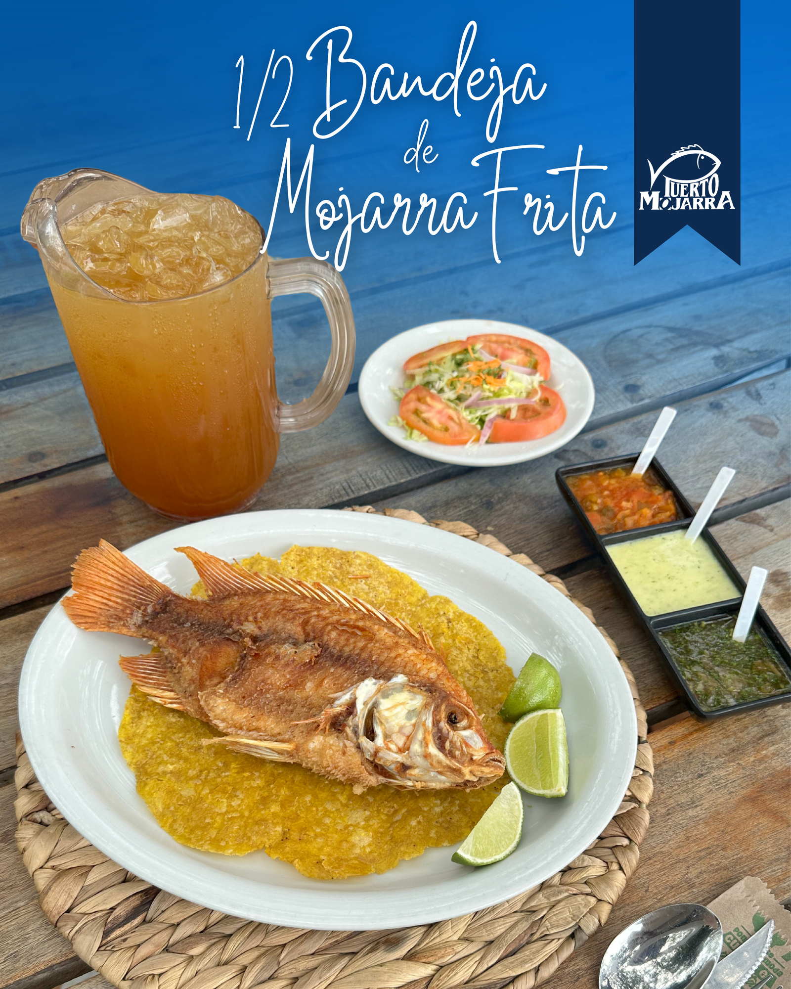 1 mojarra frescas de 380gr, frita al punto perfecto que te gusta (tu eliges si las quieres tostadas o bien jugosas). Acompañada de una ensalada fresca de lechuga batavia, zanahoria rallada, tomate y cilantro, que equilibra cada bocado. Se sirve con un patacón grande, delgado y extra crocante , ideal para disfrutar con calma y como manda la tradición.