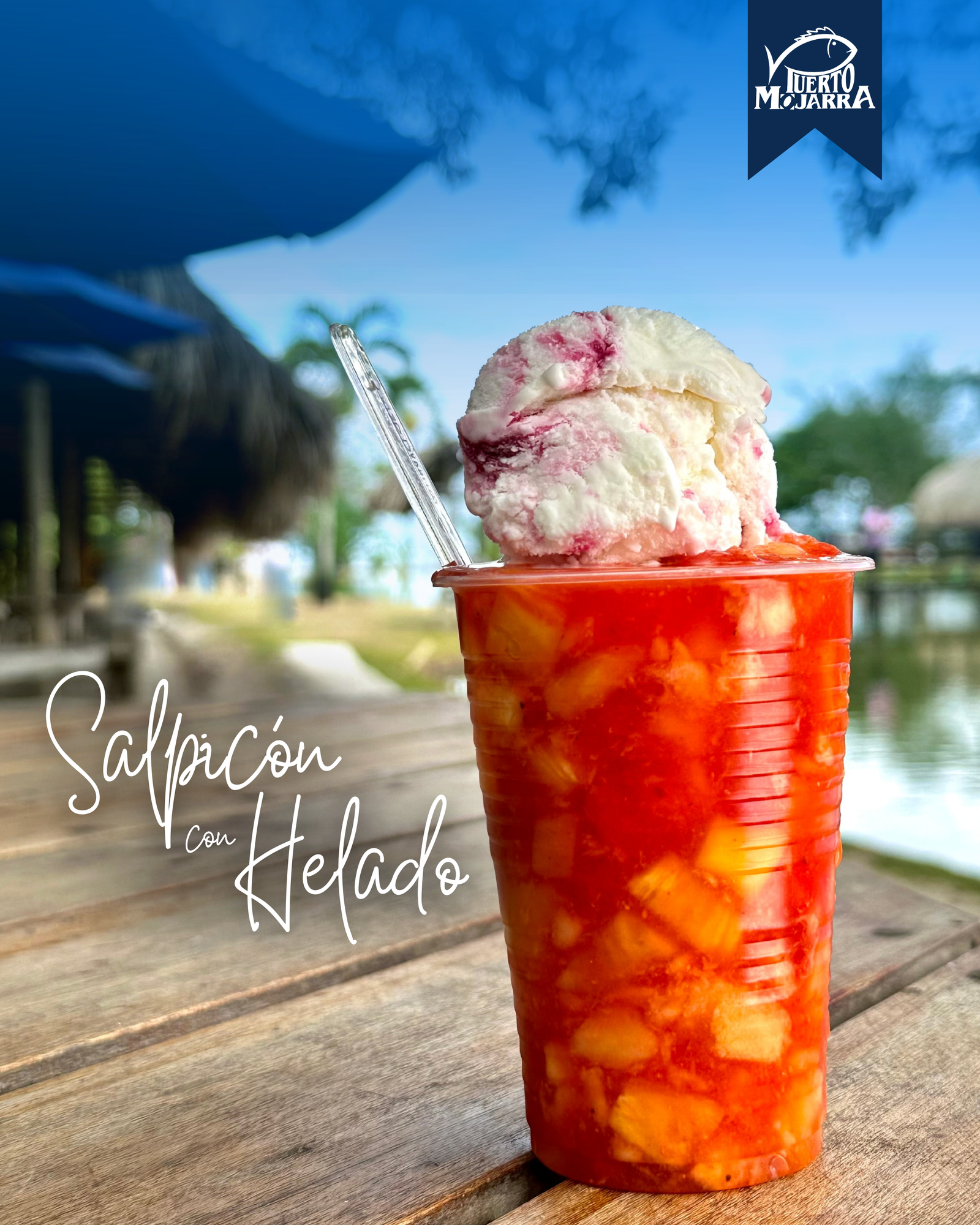 Vaso de salpicón preparado artesanalmente con fruta fresca, cuidadosamente seleccionada para lograr una mezcla refrescante, natural y llena de sabor, coronado con una bola de helado. Una bebida ligera, dulce y vibrante, ideal para refrescarte y disfrutar en cualquier momento del día.